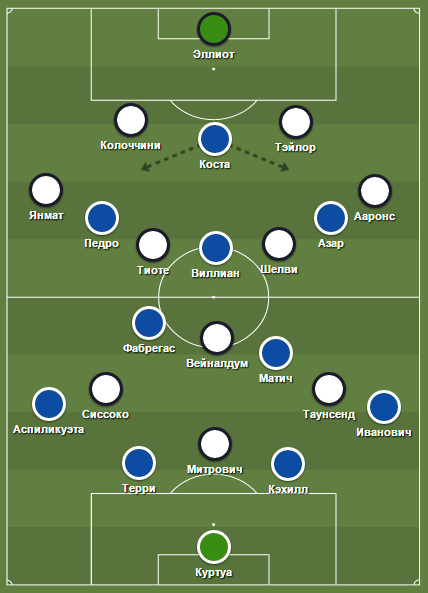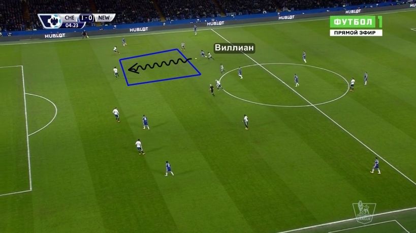 Виллиан врывается в свободную зону на полуфланге, чтобы затем точной передачей вывести Диего Косту 1 на 1 с Робом Эллиотом; также в данном эпизоде стоит отметить большой разрыв между линиями защиты и полузащиты соперника (нехватка вертикальной компактности)