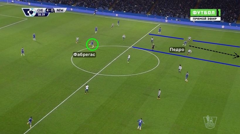 Фабрегас с мячом в центре поля, линия обороны «Ньюкасла» в высокой позиции, никто из полузащитников «сорок» не встречает Сеска, что позволяет испанцу выполнить точную передачу на забегающего по левому полуфлангу Педро