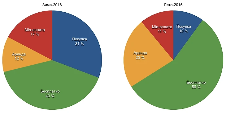 За полгода существенно сократились доли бесплатных сделок (на 16 процентов) и аренд (на 11%).