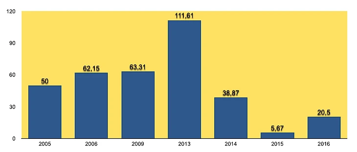 Зимние трансферные расходы по сравнению с прошлым годом увеличились в 3,6 раза (к сумме от Transfermarkt добавлена суммарная стоимость Кокорина и Жиркова – 2,5 млн евро, ее источник не учитывал). Для наглядности в диаграммах использованы данные 10-летней давности, последних четырех сезонов и окна после мирового финансового кризиса 2008 года.