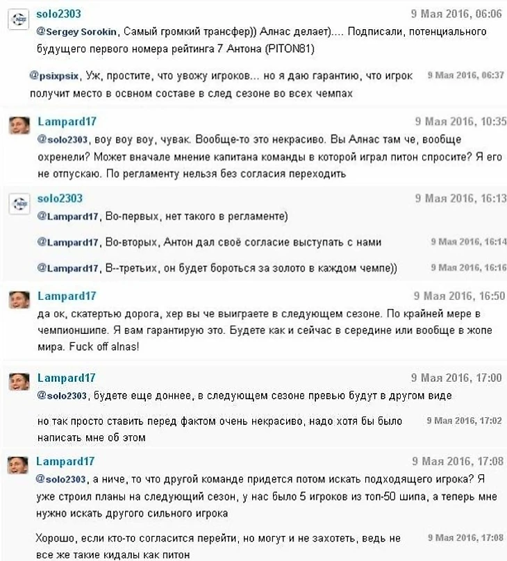 Что случилось: капитан команды-династии Alnas solo2303 (Артур) объявил, после окончания турнира Чемпионшипа, что игрок PITON81 пополнит ряды команды в каждом чемпионате на следующий сезон (прим. рейтинг игрока на 5 апреля 10FR - 130, 7FR - 37). Сие действо возмутило капитана команды из которой ушел игрок Lampard17 (Дениса).