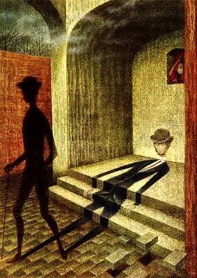 ..."Эта картина называется Мимикрия. Ее суть в том, что если люди останавливаются в своем развитии и пути, то они просто превращаются в мебель…Женщина на стуле,настолько пассивна и недвижима, что ее лицо уже стало цвета обивки,а руки приняли форму ручек…Кошка смотрит на нее с ужасом…А в это время комната уже начала жить своей жизнью…Вот стул заигрывает со шкафчиком"…