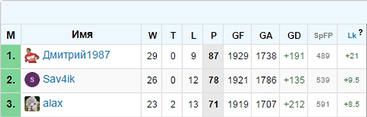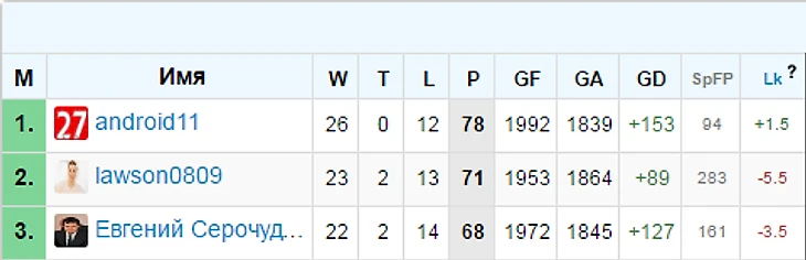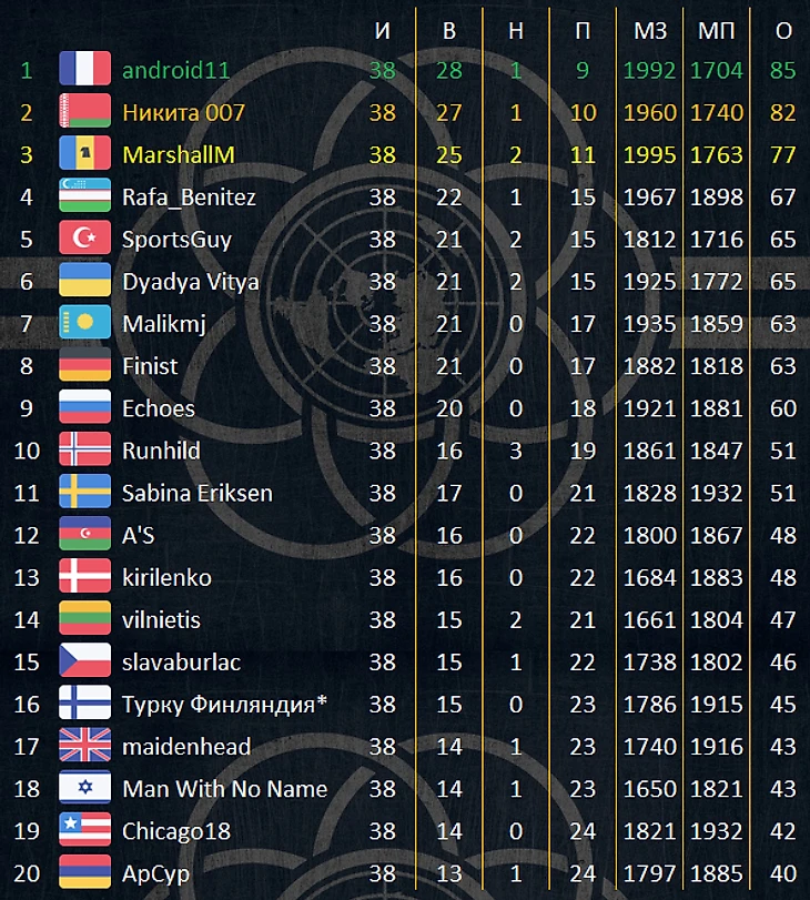 Отдельно хотел бы выделить лигу по интересом под названием "Лига Единства Наций", в которой были собраны представители 20-ти стран мира. Итоговая турнирная таблица выглядит следующим образом: