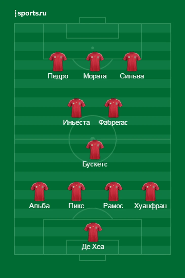 Для начала мы можем представить, что сборная Испании будет играть примерно то же, что и раньше – с гипертрофированным участием полузащиты. Центральная роль в таком построении отводится Сеску Фабрегасу. Фабрегас – один из самых неоднозначных игроков в истории команды. Его ждали в роли хавизаменителя или, как минимум, «четвертого номера» сборной, а он себя нашел годами позже в роли «ложной девятки». Теперь же он должен занять промежуточную позицию и номинально исполнять роль медиапунты в классическом испанском построении. Номинально, потому что богатый выбор мастеров мирового уровня исключит в построении любую статику.