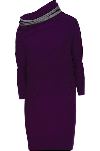 Работая над Y-3 Ямамамото привносит в спортивную одежду свои фирменные силуэты, сочетания фактур и игру объемов, как, например, в этом фиолетовом платье из кашемира с воротником-трансформером (примерно $650).