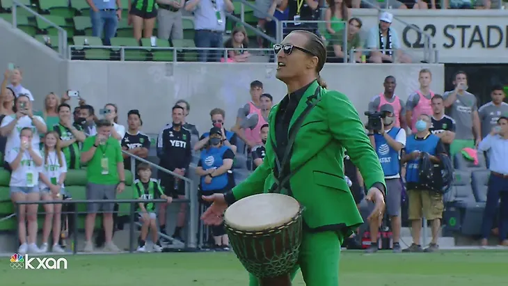 Стук в барабан и зеленый наряд – посмотрите, как Мэттью Макконахи заводил фанатов «Остина» перед первым домашним матчем сезона