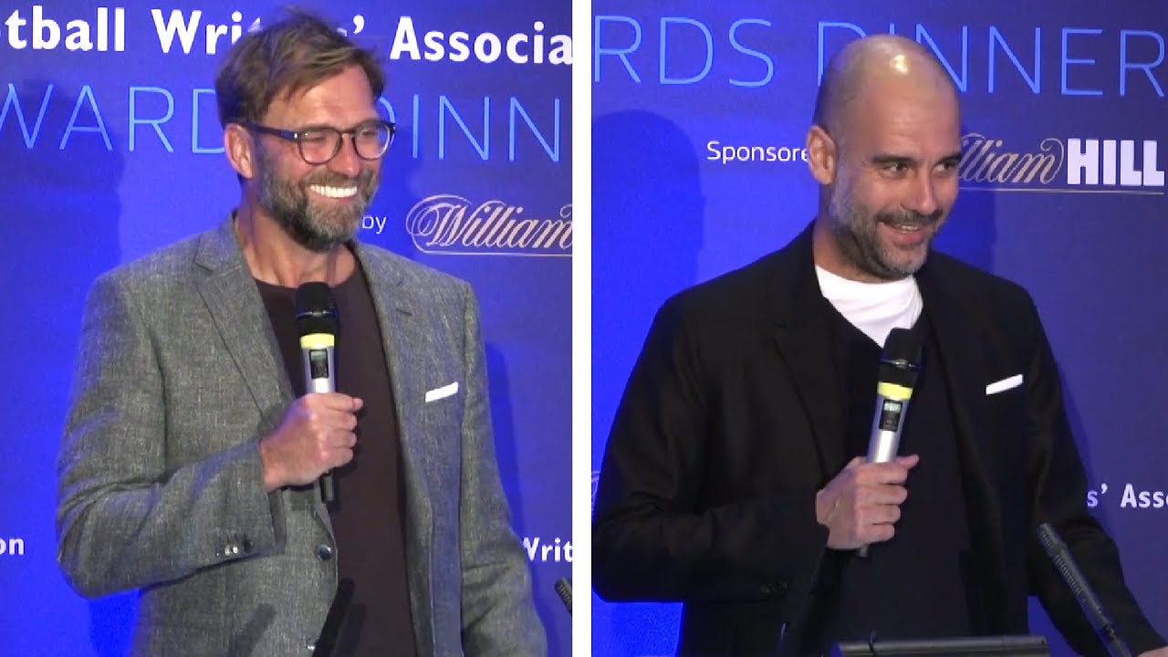 Вы это видели? / Стендап-шоу Юргена и Пепа на торжественном ужине: шутили про удар Компани, поздние голы «Ливерпуля» и предлагали обмен трофеями