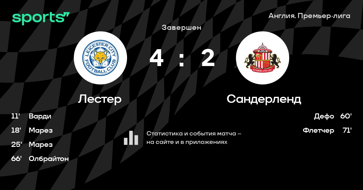 Шмейхель - Шлупп, Морган, Хут, де Лат - Марез, Дринкуотер, Кинг, Олбрайтон - Варди, ОкадзакиЗапасные: Шварцер, Беналуан, Фукс, Хэммонд, Канте, Крамарич, Ульоа