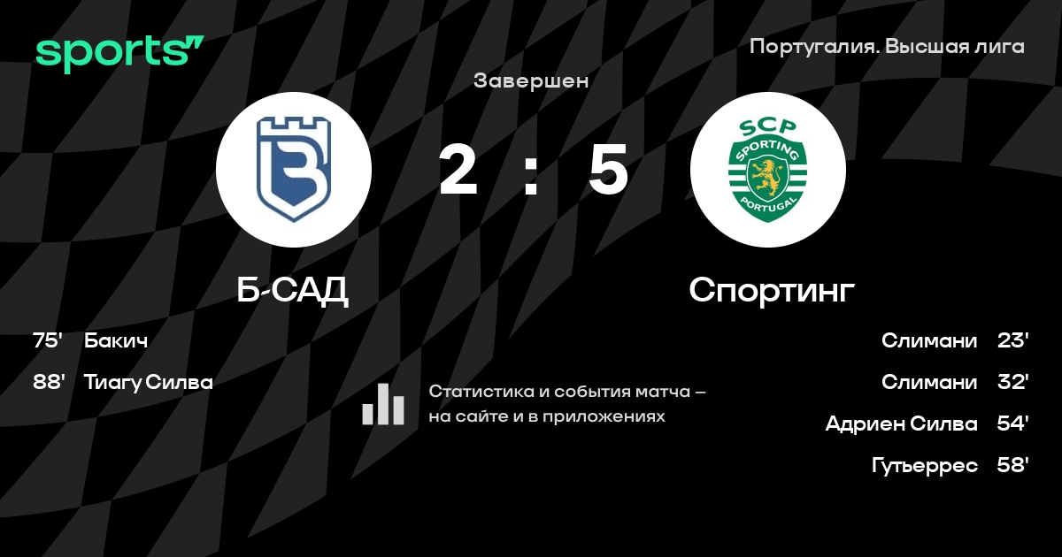 Руй Патрисиу - Коатес, Скелотто, Рубен Семеду - Жоау Мариу, Бруно Сезар, Адриен Силва, Вильям Карвалью - Руис, Гутьеррес, СлиманиЗапасные: Юг, Оливейра, Эшгайю, Матеус Перейра, Карлуш Мане, Баркос