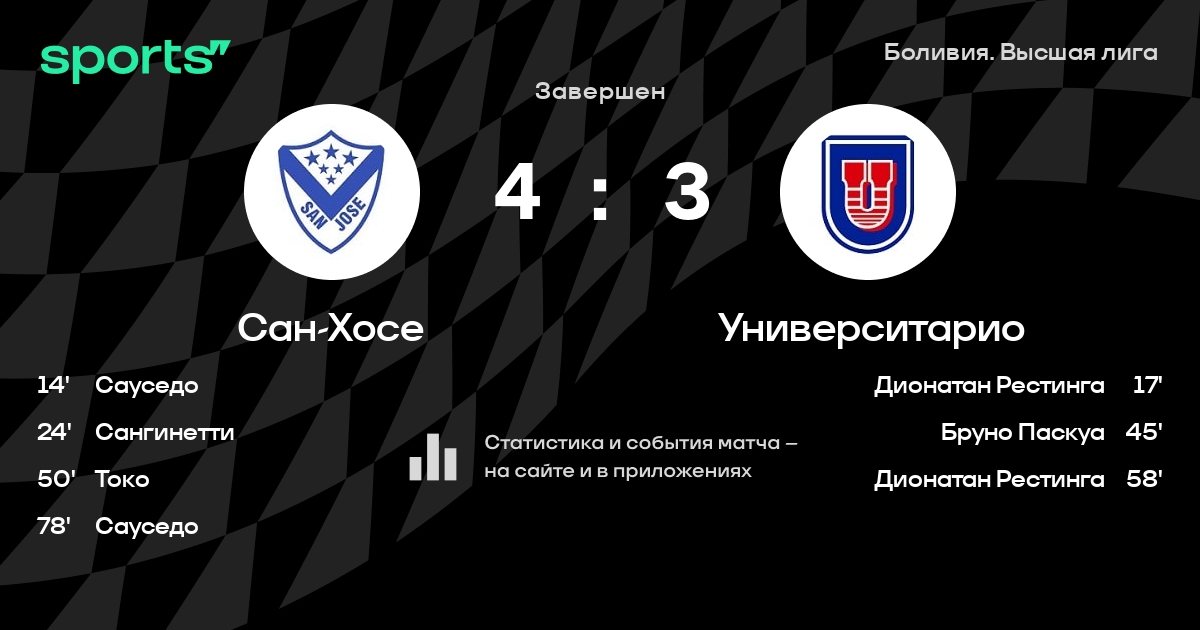 Брун - Бальсера, Куэльяр - Бруно Паскуа, Андия, Вердугес, Бехарано, Мельгар, Дионатан Рестинга - Мальдонадо, ВаргасЗапасные: Вилья, Бальдомар, Мендес, Борда, Патана, Мельгар, Лопес