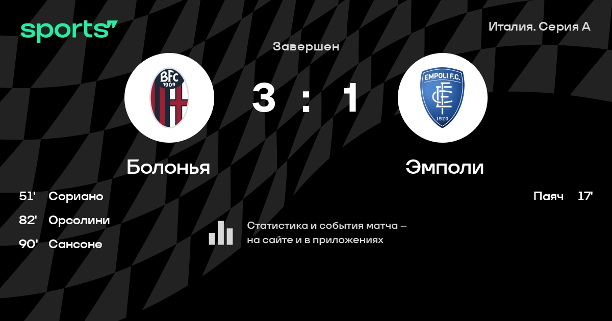 Скорупски - Дейкс, Войнович, Ларангейра, Мбайе - Джемаили, Пульгар, Сориано, Сансоне, Орсолини - ПаласиоЗапасные: Анжело, Калабрези, Хеландер, Пас, Донса, Эдера, Крейчи, Поли, Сванберг, Дестро, Фальчинелли, Сантандер