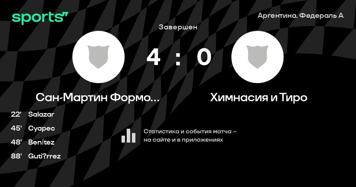 | 1 | Сан-Мартин Формоса | 2 | 0 | 2 | 0 | 3 | 3 | 0 | 2 | ||