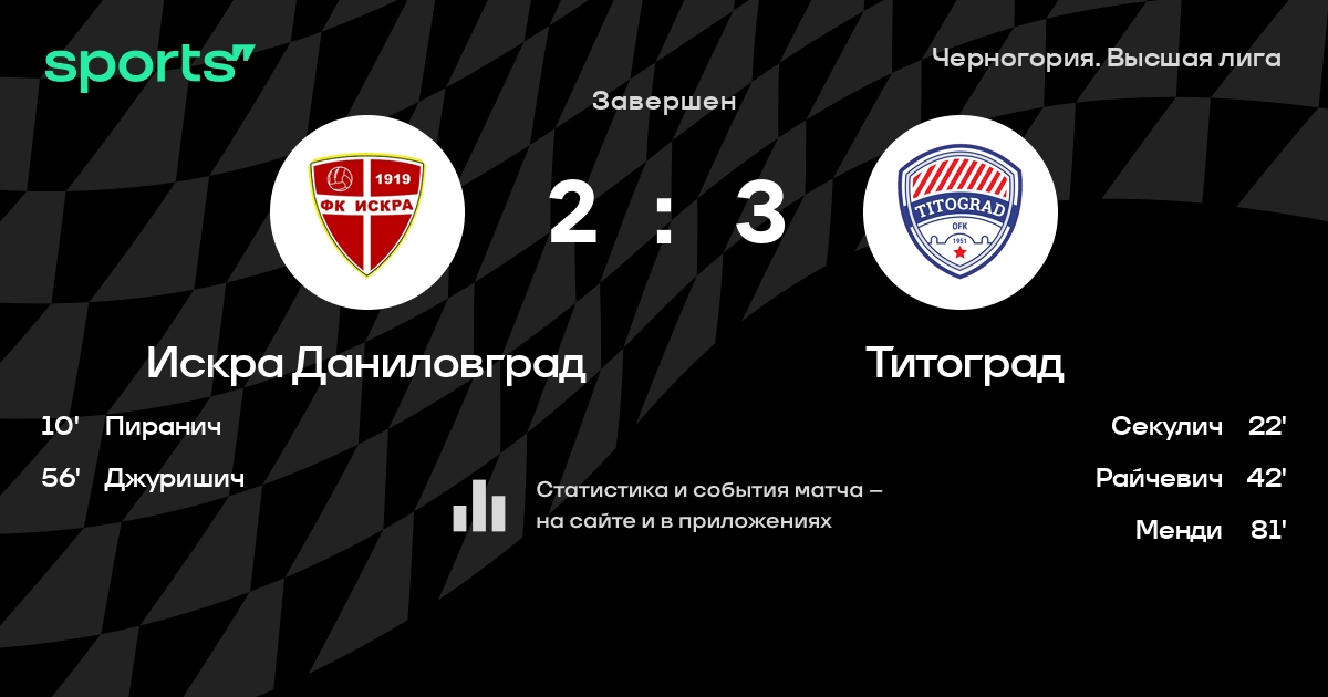 | 5 | Искра Даниловград | 36 | 13 | 11 | 12 | 46 | 39 | +7 | 50 | ||