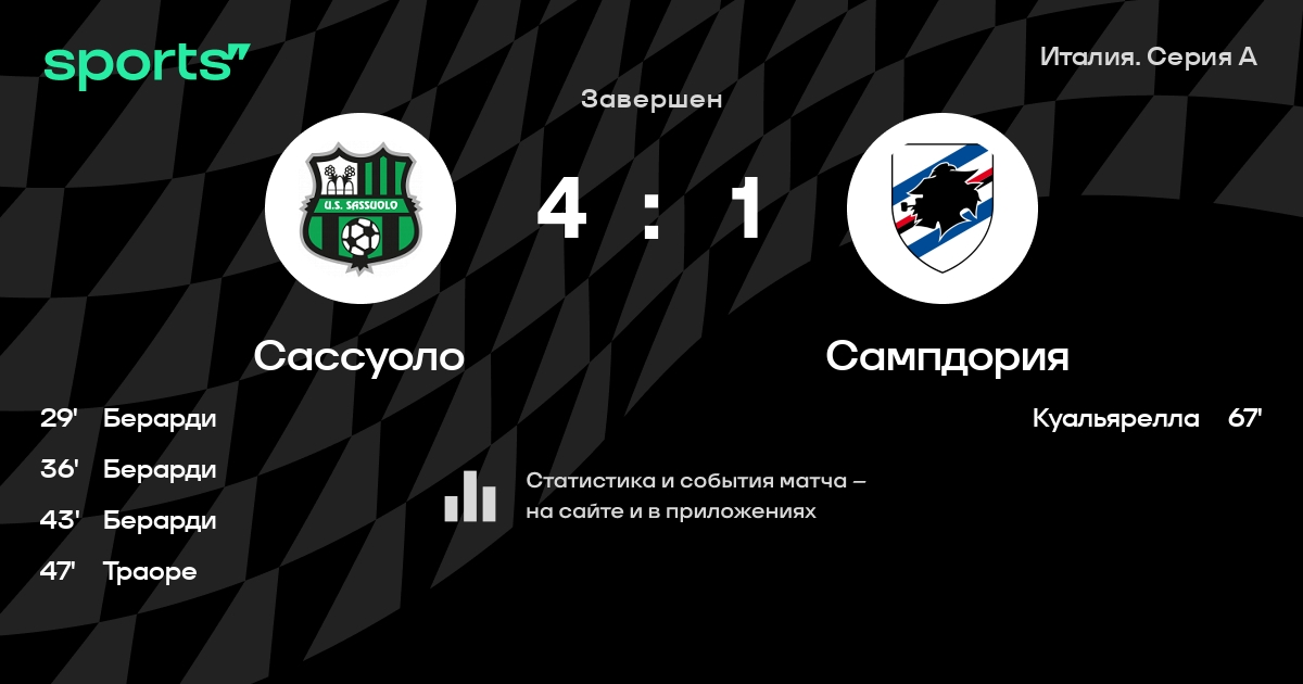 Консильи - Пелузо, Феррари, Марлон, Мюльдюр - Локателли, Обианг, Данкан, Траоре - Капуто, БерардиЗапасные: Пеголо, Гольданига, Толян, Трипальделли, Гион, Маццителли, Джуричич, Бога, Бриньола, Дефрель, Матри, Распадори
