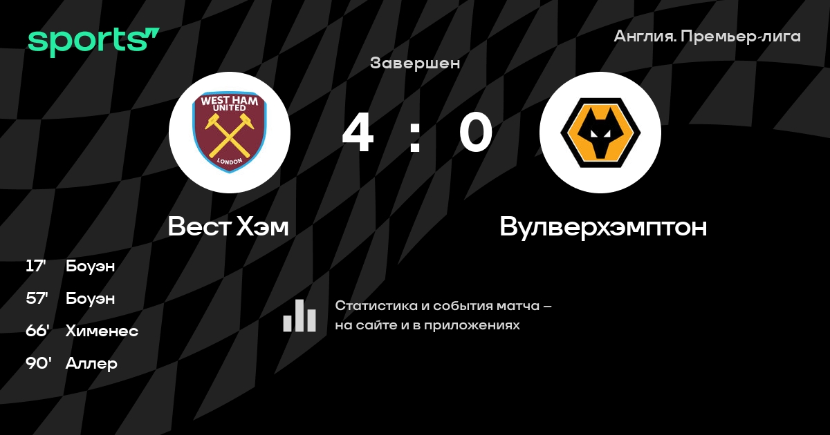 Фабианьски - Масуаку, Крессуэлл, Огбонна, Бальбуэна, Фредерикс - Форнальс, Райс, Соучек, Боуэн - АнтониоЗапасные: Рэндолф, Джонсон, Фелипе Андерсон, Лансини, Нобл, Ярмоленко, Аллер