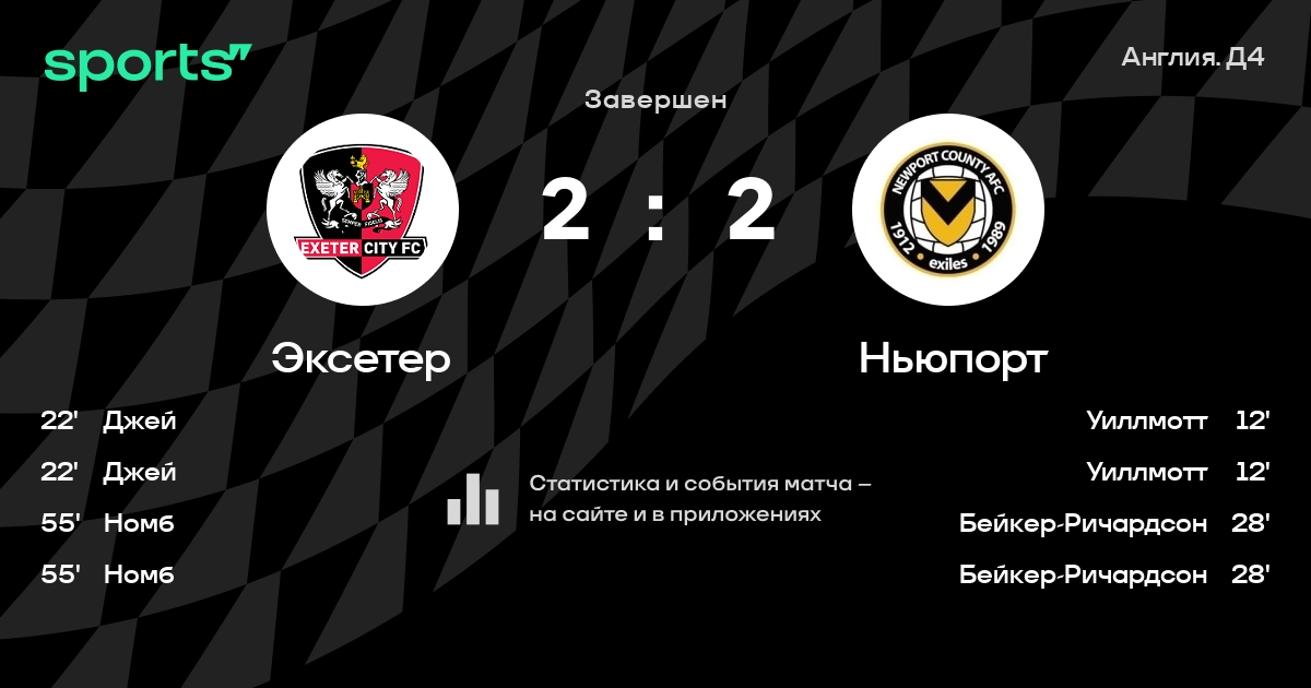 Эксетер – Ньюпорт: Ньюпорт не проигрывает в 6 из 8 последних матчей против этого соперника в турнире «Англия. Вторая Лига»