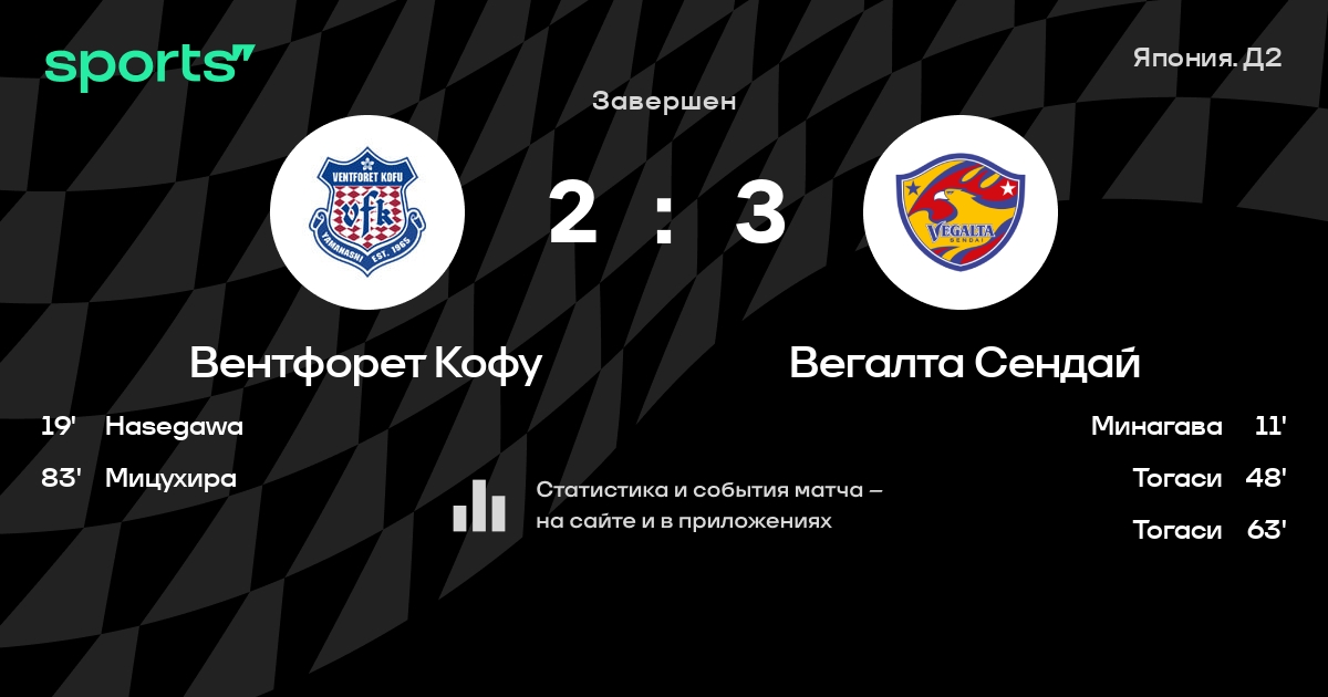 Вентфорет Кофу – Вегалта Сендай: Вегалта Сендай не проигрывает в 6 из 8 последних матчей против этого соперника в гостях