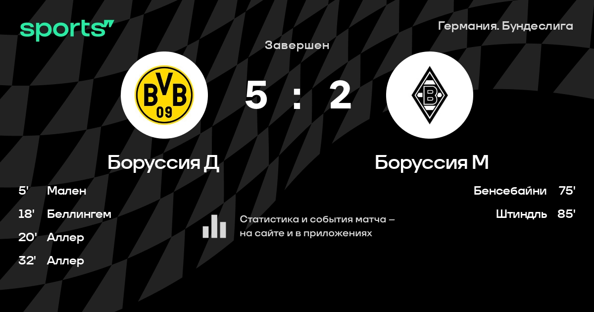 Кобель - Рюэрсон, Хуммельс, Зюле, Вольф - Джан, Беллингем, Адейеми, Брандт, Мален - АллерЗапасные: Майер, Геррейру, Пасслак, Шлоттербек, Ройс, Рейна, Озджан, Модест, Мукоко