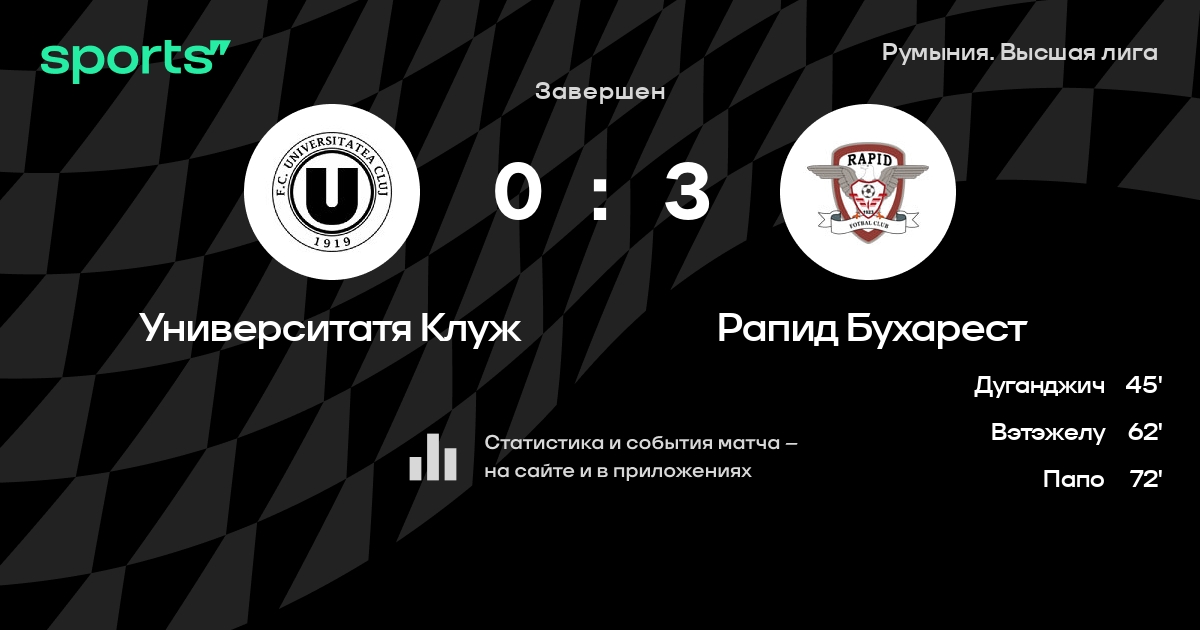 Университатя Клуж – Рапид Бухарест: Рапид Бухарест не пропускает в 5 последних матчах против этого соперника
