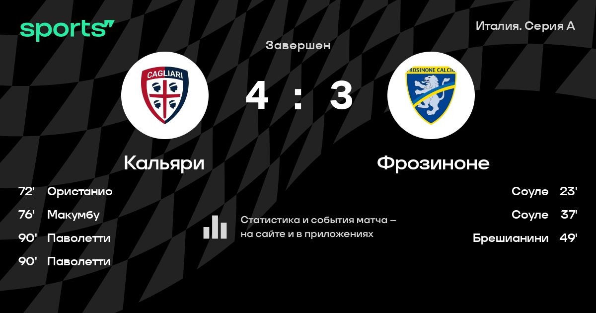 «Кальяри» уступал «Фрозиноне» 0:3 к 72-й минуте, но победил. В лайве камбэк шел за 151.00