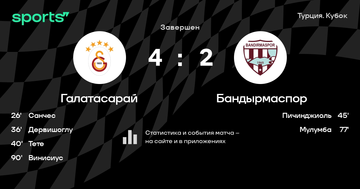 Гювенч - Караташ, Кутлу, Санчес, Йылмаз - Айдын, Ндомбеле, Заа, Дервишоглу, Тете - ВинисиусЗапасные: Йылмаз, Нельссон, Ешильюрт, Бюльбюль, Акман, Гюрпюз, Акман, Икарди, Демироглу, Актюркоглу