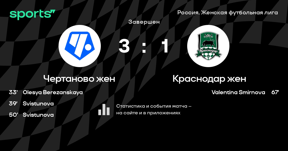 Результат прошлой игры в турнире «Женская футбольная лига»: Чертаново жен – ЦСКА жен 0:4. После 17 туров Чертаново жен набирает 10 очков и занимает 12 место в турнире. Лучший бомбардир команды – O. Berezanskaya: он забил 4 в 13 матчах. В последних 5 играх Чертаново жен забивает 5 голов. В последних 5 играх Чертаново жен пропускает 9 голов.