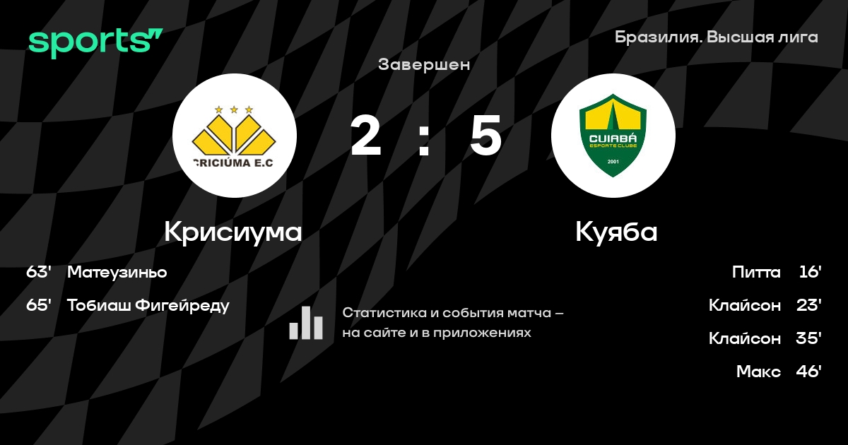 Результат прошлой игры в турнире «Серия A»: Крисиума – Палмейрас 1:2. После 4 туров Крисиума набирает 5 очков и занимает 16 место в турнире. Лучший бомбардир команды – Феллипе Матеус: он забил 5 в 23 матчах. В 4 последних матчах в турнире «Серия A» Крисиума обязательно забивает. В последних 5 играх Крисиума забивает 6 голов. В последних 5 играх Крисиума пропускает 6 голов.