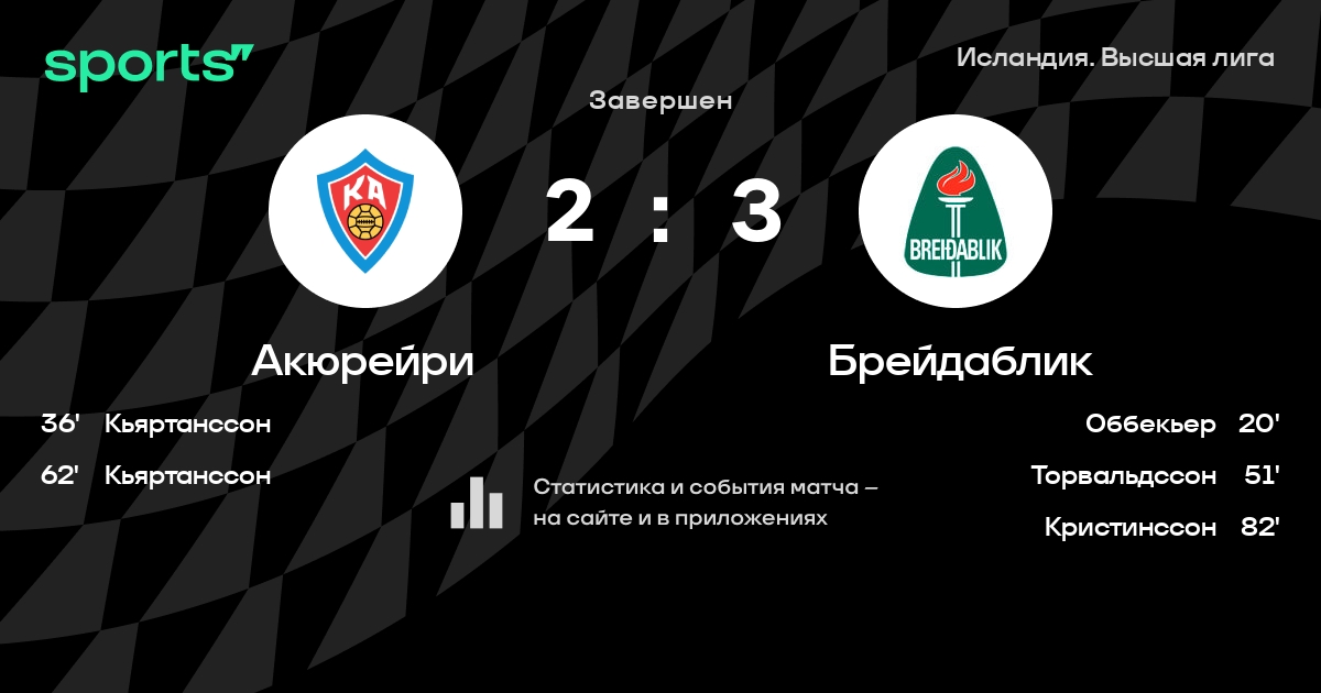 Результат прошлой игры в турнире «Высшая лига»: Фрам – Акюрейри 1:2. После 20 туров Акюрейри набирает 27 очков и занимает 7 место в турнире. Лучший бомбардир команды – Халльгримур Стейнгримссон: он забил 8 в 19 матчах. Акюрейри не проигрывает в 10 последних матчах в рамках турнира «Высшая лига». Брейдаблик имеет в активе больше всех побед в турнире – 13. В 12 последних матчах в турнире «Высшая лига» Акюрейри обязательно забивает. Акюрейри пропускает в 3 последних матчах в турнире «Высшая лига». В последних 5 играх Акюрейри забивает 7 голов. В последних 5 играх Акюрейри пропускает 5 голов.