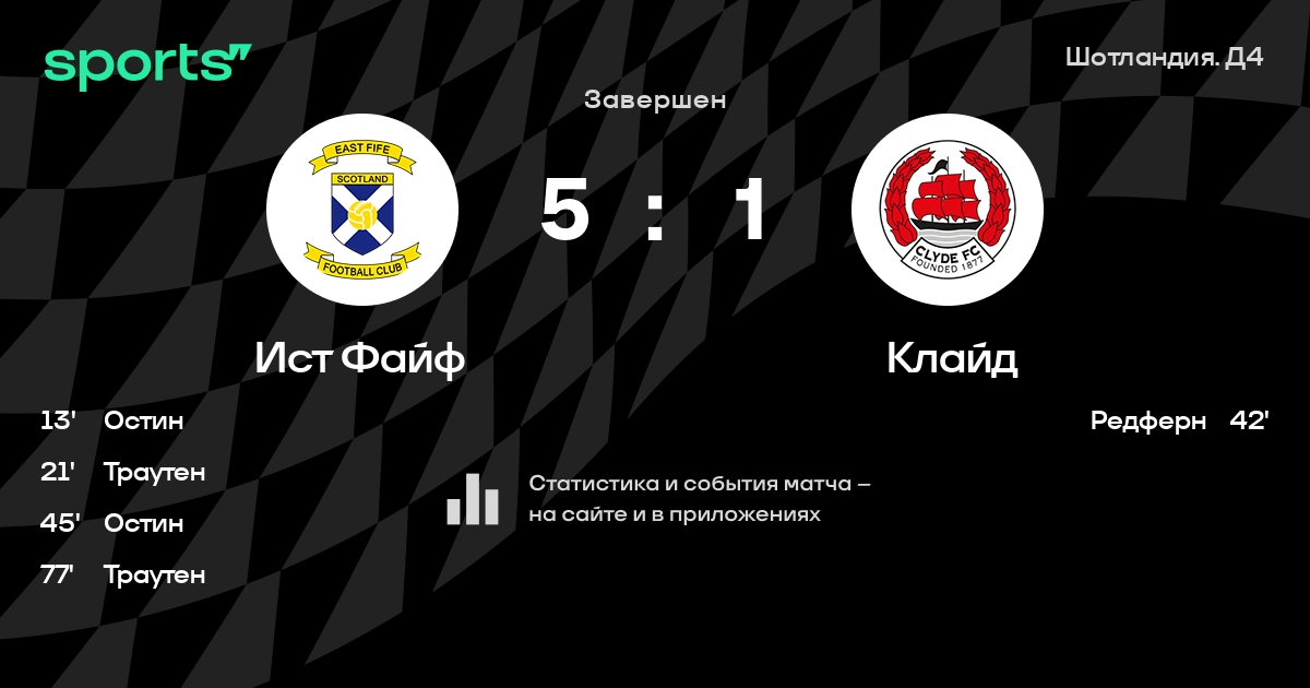 Результат прошлой игры в турнире «Лига 2»: Стерлинг Альбион – Ист Файф 0:4. После 4 туров Ист Файф набирает 9 очков и занимает 2 место в турнире. Лучший бомбардир команды – Натан Остин: он забил 7 в 8 матчах. Ист Файф побеждает в 3 последних матчах в рамках турнира «Лига 2». Ист Файф имеет лучшую разницу мячей в турнире – 5. В 5 последних матчах в турнире «Лига 2» Ист Файф обязательно забивает. Ист Файф больше всех забивает в турнире – 10 в 4. В последних 5 играх Ист Файф забивает 12 голов. В последних 5 играх Ист Файф пропускает 6 голов.
