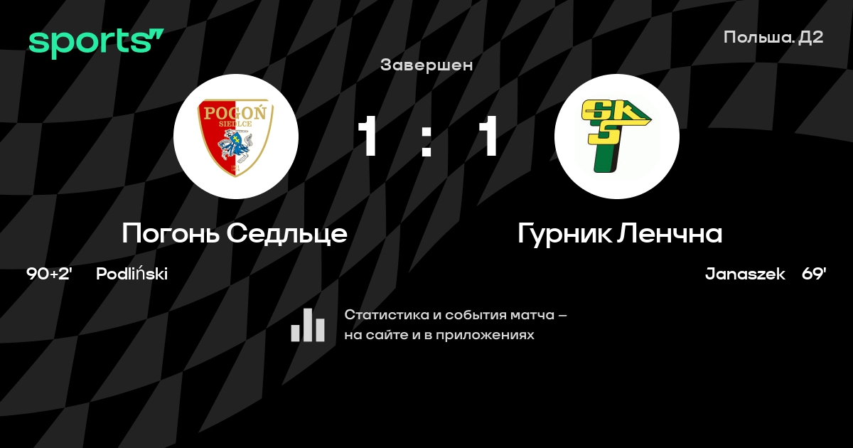 Результат прошлой игры в турнире «Первая лига»: Арка – Погонь Седльце 2:1. После 13 туров Погонь Седльце набирает 5 очков и занимает 18 место в турнире. Лучший бомбардир команды – K. Podliński: он забил 3 в 4 матчах. Погонь Седльце проигрывает в 5 последних матчах в рамках турнира «Первая лига». Погонь Седльце пропускает в 13 последних матчах в турнире «Первая лига». В последних 5 играх Погонь Седльце забивает 4 голов. В последних 5 играх Погонь Седльце пропускает 12 голов.