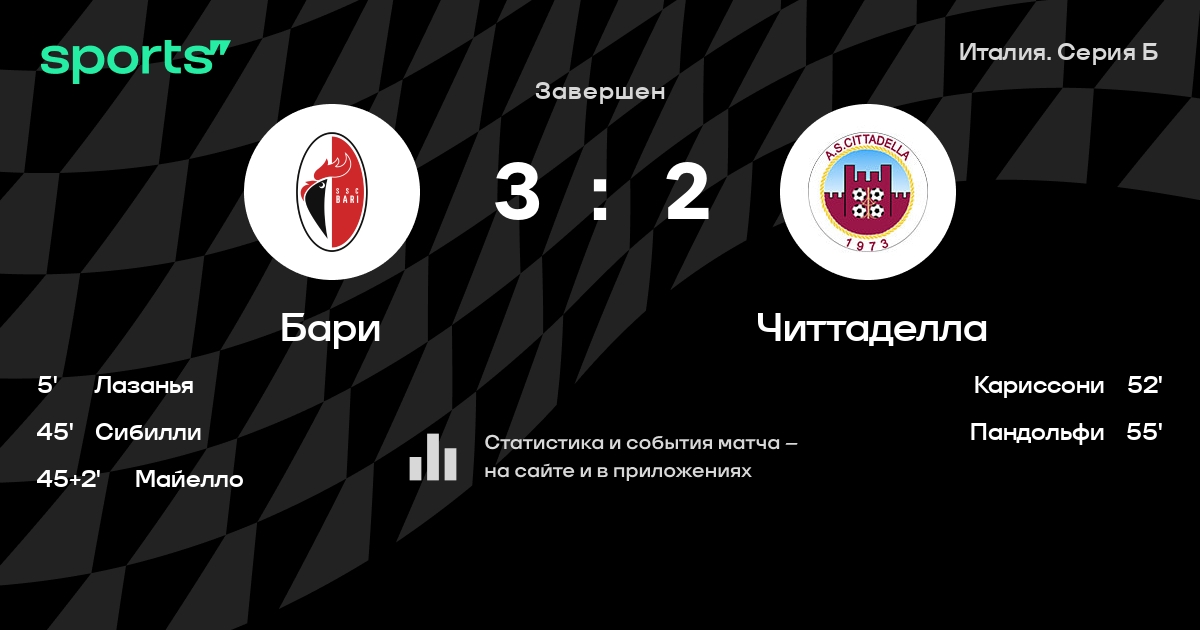 Результат прошлой игры в турнире «Серия B»: Салернитана – Бари 0:2. После 13 туров Бари набирает 17 очков и занимает 8 место в турнире. Лучший бомбардир команды – Андрия Новакович: он забил 3 в 14 матчах. Бари не проигрывает в 11 последних матчах в рамках турнира «Серия B». В последних 5 играх Бари забивает 5 голов. В последних 5 играх Бари пропускает 3 голов.