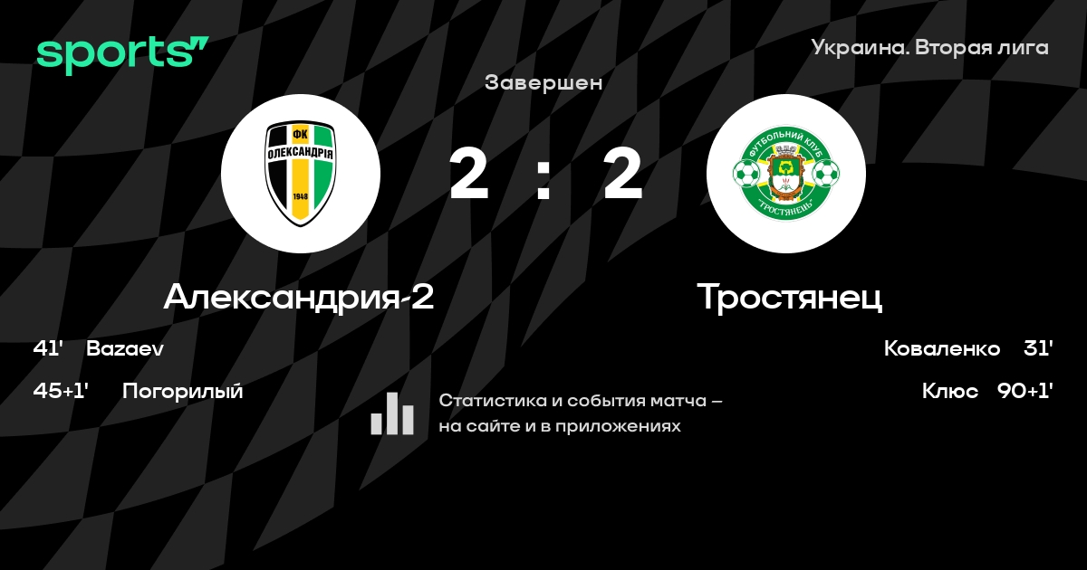 Результат прошлой игры в турнире «Вторая лига»: Vorskla Poltava II – Trostianets 2:1. После 3 туров Trostianets набирает 4 очков и занимает 5 место в турнире. Лучший бомбардир команды – V. Tyshyninov: он забил 2 в 3 матчах. В последних 5 играх Trostianets забивает 10 голов. В последних 5 играх Trostianets пропускает 4 голов.