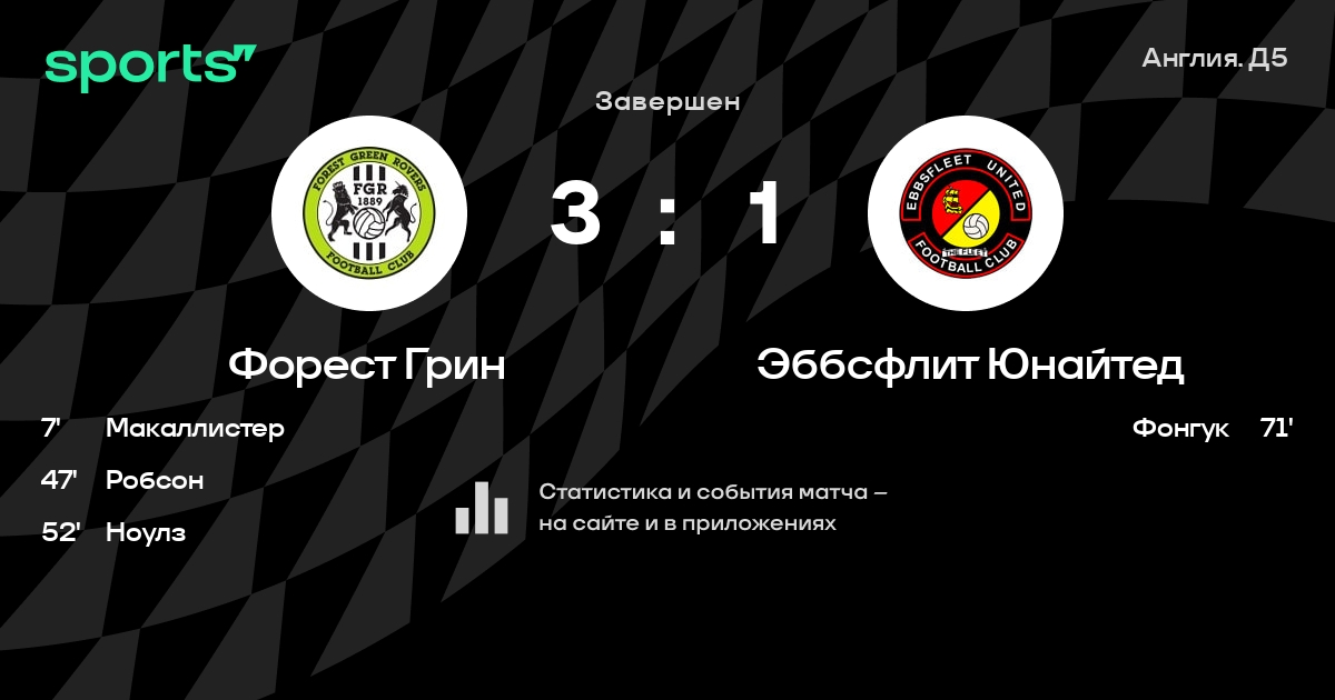 Результат прошлой игры в турнире «Д5. Национальная лига»: Форест Грин – Брэйнтри Таун 2:1. После 14 туров Форест Грин набирает 30 очков и занимает 2 место в турнире. Лучший бомбардир команды – Кристиан Дойдж: он забил 7 в 14 матчах. Форест Грин побеждает в 3 последних матчах в рамках турнира «Д5. Национальная лига». В 3 последних матчах в турнире «Д5. Национальная лига» Форест Грин обязательно забивает. В последних 5 играх Форест Грин забивает 8 голов. В последних 5 играх Форест Грин пропускает 3 голов.