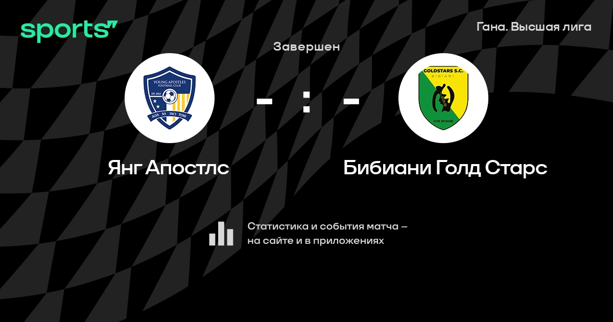 Результат прошлой игры в турнире «Премьер-лига»: Легон Ситиз – Young Apostles 2:0. После 9 туров Young Apostles набирает 9 очков и занимает 14 место в турнире. Bibiani Gold Stars FC имеет в активе больше всех побед в турнире – 5. В последних 5 играх Young Apostles забивает 2 голов. В последних 5 играх Young Apostles пропускает 5 голов.
