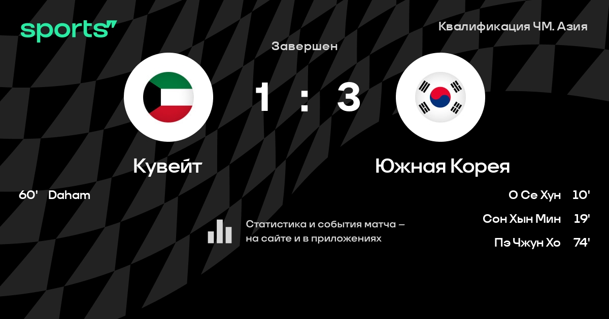 Результат прошлой игры в турнире «Квалификация ЧМ. Азия»: Южная Корея – Ирак 3:2. После 4 туров Южная Корея набирает 10 очков и занимает 1 место в турнире. Лучший бомбардир команды – Сон Хын Мин: он забил 11 в 19 матчах. Южная Корея побеждает в 3 последних матчах в рамках турнира «Квалификация ЧМ. Азия». В 3 последних матчах в турнире «Квалификация ЧМ. Азия» Южная Корея обязательно забивает. В последних 5 играх Южная Корея забивает 9 голов. В последних 5 играх Южная Корея пропускает 3 голов.