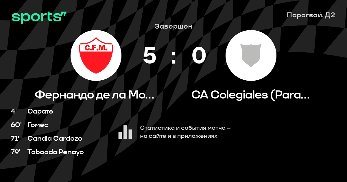 Результат прошлой игры в турнире «Сегунда»: Club Atlético Tembetary – Фернандо де ла Мора 2:0. После 28 туров Фернандо де ла Мора набирает 31 очков и занимает 13 место в турнире. Лучший бомбардир команды – L. Galeano: он забил 10 в 28 матчах. Фернандо де ла Мора не может выиграть в 6 последних матчах в рамках турнира «Сегунда». В последних 5 играх Фернандо де ла Мора забивает 3 голов. В последних 5 играх Фернандо де ла Мора пропускает 7 голов.