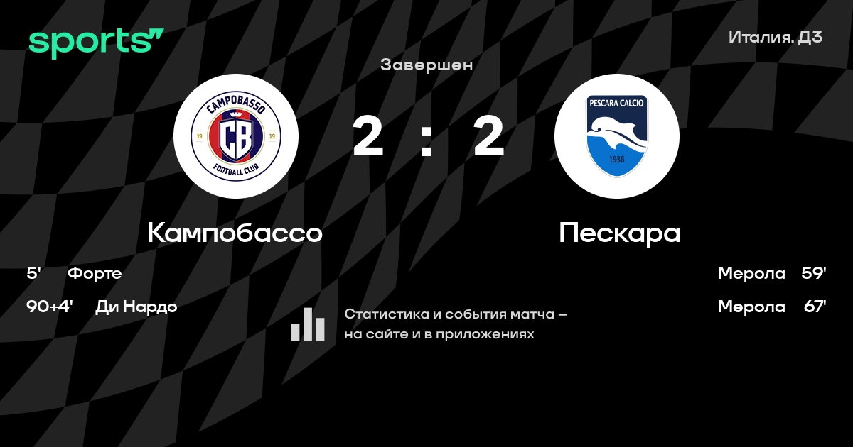 Результат прошлой игры в турнире «Серия С»: Перуджа – Кампобассо 2:1. После 18 туров Кампобассо набирает 24 очков и занимает 8 место в турнире. Лучший бомбардир команды – Лоренцо Ди Стефано: он забил 6 в 15 матчах. Кампобассо не может выиграть в 5 последних матчах в рамках турнира «Серия С». В 3 последних матчах в турнире «Серия С» Кампобассо обязательно забивает. Кампобассо пропускает в 4 последних матчах в турнире «Серия С». В последних 5 играх Кампобассо забивает 3 голов. В последних 5 играх Кампобассо пропускает 8 голов.