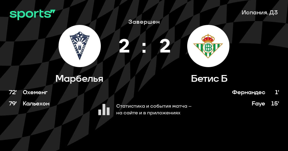 Результат прошлой игры в турнире «Первый дивизион RFEF»: Вильярреал Б – Марбелья 1:1. После 16 туров Марбелья набирает 19 очков и занимает 14 место в турнире. Лучший бомбардир команды – Дориан: он забил 3 в 10 матчах. Марбелья не может выиграть в 6 последних матчах в рамках турнира «Первый дивизион RFEF». Марбелья пропускает в 5 последних матчах в турнире «Первый дивизион RFEF». В последних 5 играх Марбелья забивает 5 голов. В последних 5 играх Марбелья пропускает 9 голов.