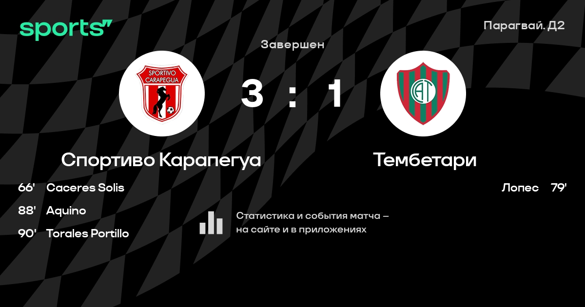 Результат прошлой игры в турнире «Сегунда»: 12 de Junio VH – Спортиво Карапегуа 1:2. После 29 туров Спортиво Карапегуа набирает 55 очков и занимает 3 место в турнире. Лучший бомбардир команды – A. Giménez: он забил 10 в 29 матчах. Спортиво Карапегуа не проигрывает в 5 последних матчах в рамках турнира «Сегунда». В 4 последних матчах в турнире «Сегунда» Спортиво Карапегуа обязательно забивает. Спортиво Карапегуа пропускает в 3 последних матчах в турнире «Сегунда». В последних 5 играх Спортиво Карапегуа забивает 7 голов. В последних 5 играх Спортиво Карапегуа пропускает 3 голов.