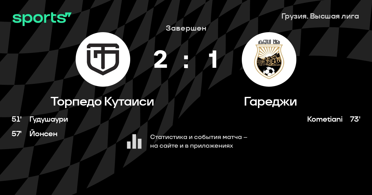 Результат прошлой игры в турнире «Высшая лига»: Динамо Тбилиси – Торпедо Кутаиси 2:2. После 35 туров Торпедо Кутаиси набирает 60 очков и занимает 3 место в турнире. Лучший бомбардир команды – Бьорн Маарс Йонсен: он забил 22 в 38 матчах. Торпедо Кутаиси не проигрывает в 4 последних матчах в рамках турнира «Высшая лига». В 4 последних матчах в турнире «Высшая лига» Торпедо Кутаиси обязательно забивает. В последних 5 играх Торпедо Кутаиси забивает 15 голов. В последних 5 играх Торпедо Кутаиси пропускает 6 голов.