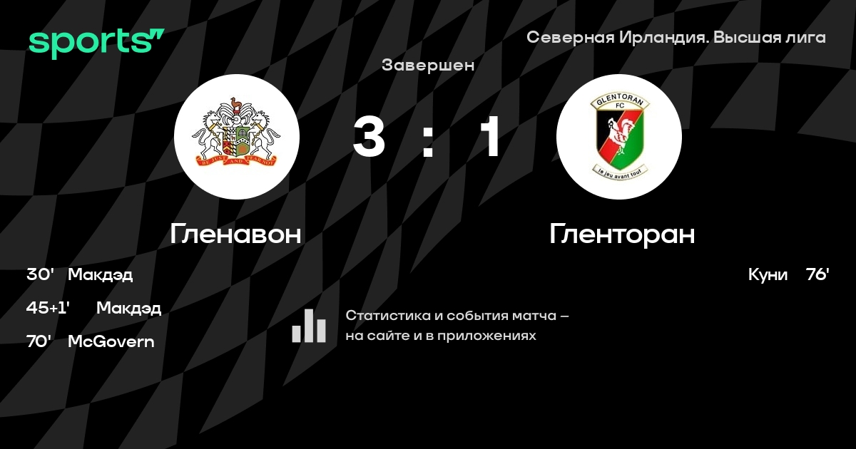 Результат прошлой игры в турнире «Премьер-лига»: Колрейн – Гленавон 5:1. После 14 туров Гленавон набирает 3 очков и занимает 12 место в турнире. Лучший бомбардир команды – P. McGovern: он забил 2 в 13 матчах. В последних 5 играх Гленавон забивает 2 голов. В последних 5 играх Гленавон пропускает 10 голов.