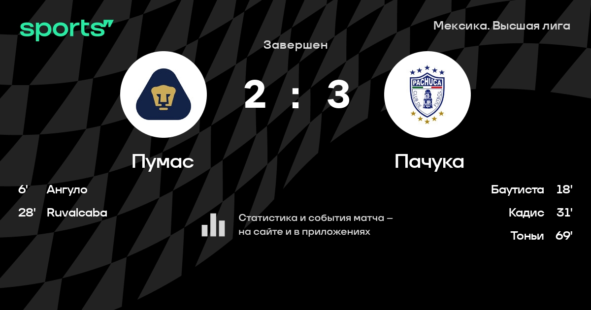 Результат прошлой игры в турнире «Высшая лига»: Сантос Лагуна – Пумас 3:0. Пумас пропускает в 4 последних матчах в турнире «Высшая лига». В последних 5 играх Пумас забивает 4 голов. В последних 5 играх Пумас пропускает 8 голов.