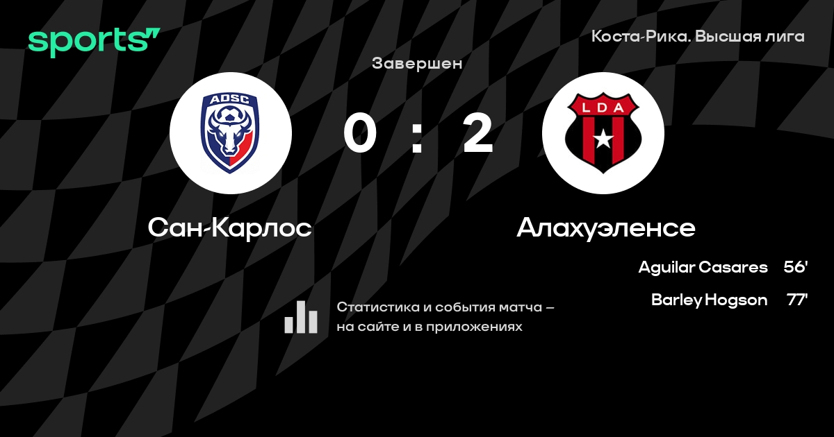 Результат прошлой игры в турнире «Высшая лига»: Эредиано – Сан-Карлос 3:1. Лучший бомбардир команды – Рашид Чирино: он забил 4 в 16 матчах. Сан-Карлос не может выиграть в 4 последних матчах в рамках турнира «Высшая лига». Алахуэленсе имеет в активе больше всех побед в турнире – 11. В 5 последних матчах в турнире «Высшая лига» Сан-Карлос обязательно забивает. Сан-Карлос пропускает в 19 последних матчах в турнире «Высшая лига». В последних 5 играх Сан-Карлос забивает 7 голов. В последних 5 играх Сан-Карлос пропускает 8 голов.