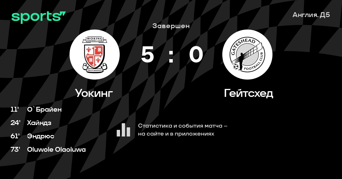 Результат прошлой игры в турнире «Д5. Национальная лига»: Галифакс Таун – Уокинг 1:1. После 7 туров Уокинг набирает 5 очков и занимает 21 место в турнире. Лучший бомбардир команды – Аарон Дрю: он забил 1 в 6 матчах. Уокинг не проигрывает в 3 последних матчах в рамках турнира «Д5. Национальная лига». В 3 последних матчах в турнире «Д5. Национальная лига» Уокинг обязательно забивает. В последних 5 играх Уокинг забивает 5 голов. В последних 5 играх Уокинг пропускает 7 голов.