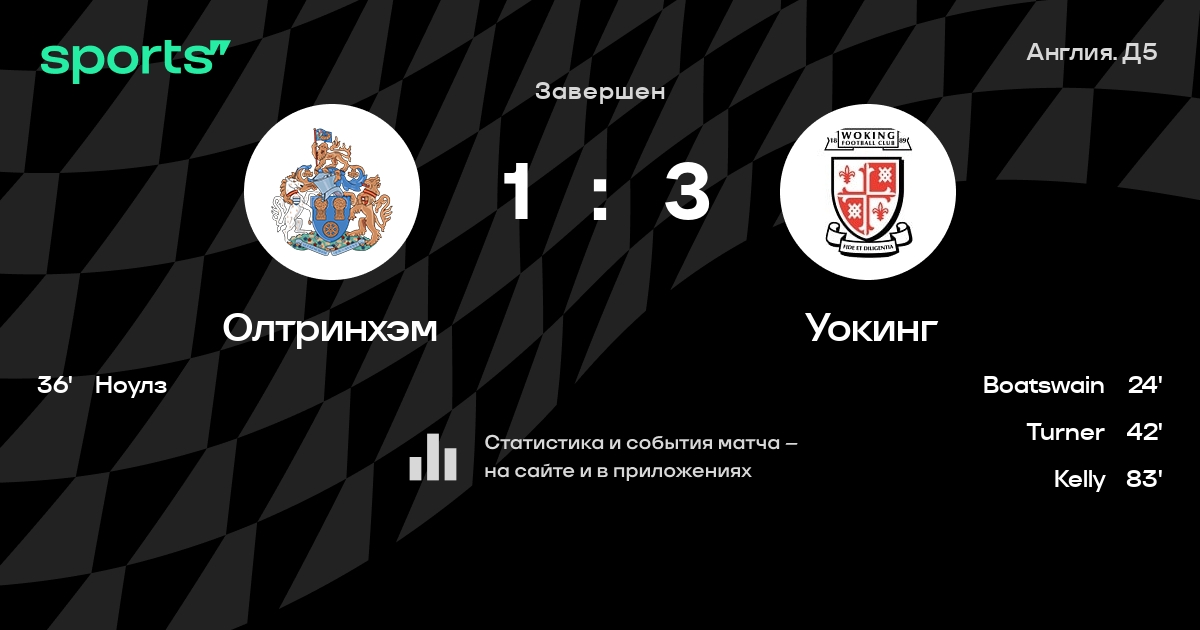 Результат прошлой игры в турнире «Д5. Национальная лига»: Уилдстон – Олтринхэм 1:1. После 14 туров Олтринхэм набирает 13 очков и занимает 20 место в турнире. Лучший бомбардир команды – Джимми Ноулз: он забил 6 в 15 матчах. Олтринхэм не может выиграть в 6 последних матчах в рамках турнира «Д5. Национальная лига». Олтринхэм пропускает в 7 последних матчах в турнире «Д5. Национальная лига». В последних 5 играх Олтринхэм забивает 7 голов. В последних 5 играх Олтринхэм пропускает 6 голов.