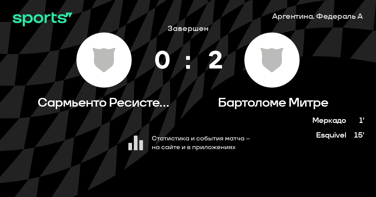 Результат прошлой игры в турнире «Торнео Федераль A»: Крусеро дель Норте – Сармьенто Ресистенсия 2:3. После 16 туров Сармьенто Ресистенсия набирает 18 очков и занимает 7 место в турнире. Лучший бомбардир команды – R. Montenegro: он забил 2 в 9 матчах. Сармьенто Ресистенсия не проигрывает в 3 последних матчах в рамках турнира «Торнео Федераль A». В 3 последних матчах в турнире «Торнео Федераль A» Сармьенто Ресистенсия обязательно забивает. Сармьенто Ресистенсия пропускает в 7 последних матчах в турнире «Торнео Федераль A». В последних 5 играх Сармьенто Ресистенсия забивает 9 голов. В последних 5 играх Сармьенто Ресистенсия пропускает 7 голов.