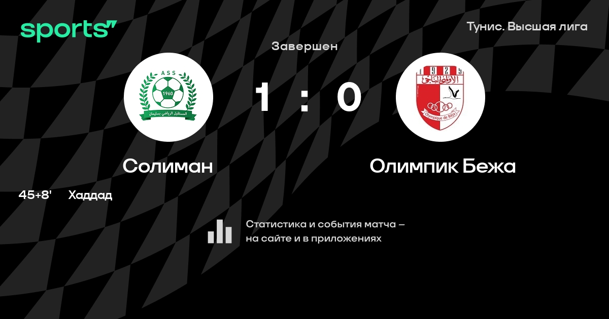 Результат прошлой игры в турнире «Лига 1»: Эсперанс – Солиман 2:0. После 4 туров Солиман набирает 1 очков и занимает 16 место в турнире. Лучший бомбардир команды – D. Jebli: он забил 1 в 3 матчах. Солиман не может выиграть в 4 последних матчах в рамках турнира «Лига 1». В 4 последних матчах в турнире «Лига 1» Солиман обязательно забивает. В последних 5 играх Солиман забивает 1 голов. В последних 5 играх Солиман пропускает 4 голов.