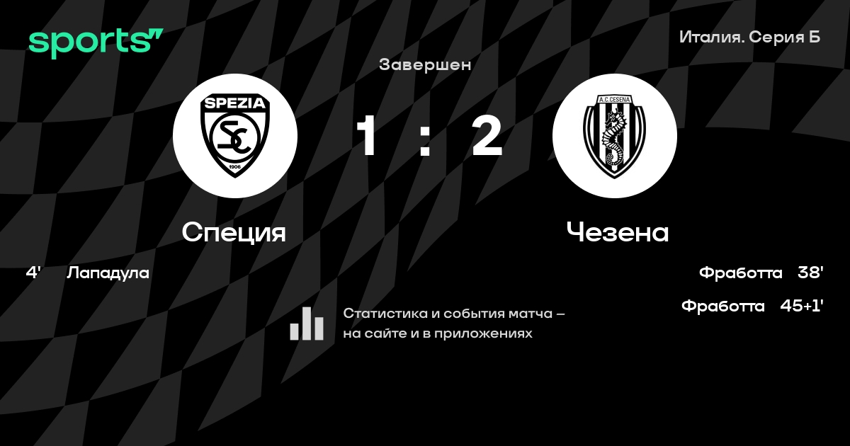 Результат прошлой игры в турнире «Серия B»: Специя – Палермо 1:2. После 7 туров Специя набирает 3 очков и занимает 20 место в турнире. Лучший бомбардир команды – Джанлука Лападула: он забил 2 в 5 матчах. Специя не может выиграть в 9 последних матчах в рамках турнира «Серия B». Специя пропускает в 5 последних матчах в турнире «Серия B». В последних 5 играх Специя забивает 5 голов. В последних 5 играх Специя пропускает 10 голов.