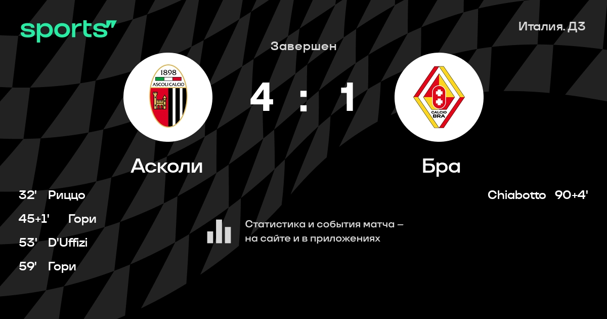 Результат прошлой игры в турнире «Серия С»: Торрес – Асколи 0:1. После 7 туров Асколи набирает 17 очков и занимает 3 место в турнире. Лучший бомбардир команды – S. D'Uffizi: он забил 3 в 5 матчах. Асколи побеждает в 4 последних матчах в рамках турнира «Серия С». В 4 последних матчах в турнире «Серия С» Асколи обязательно забивает. Асколи не пропускает в 7 последних матчах в турнире «Серия С». В последних 5 играх Асколи забивает 9 голов. В последних 5 играх Асколи пропускает 0 голов.