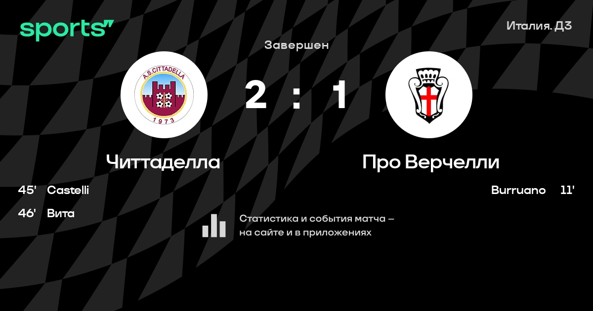 Результат прошлой игры в турнире «Серия С»: Интер-2 – Читтаделла 0:1. После 11 туров Читтаделла набирает 15 очков и занимает 8 место в турнире. Лучший бомбардир команды – M. Gaddini: он забил 2 в 8 матчах. Читтаделла побеждает в 3 последних матчах в рамках турнира «Серия С». В 3 последних матчах в турнире «Серия С» Читтаделла обязательно забивает. В последних 5 играх Читтаделла забивает 4 голов. В последних 5 играх Читтаделла пропускает 1 голов.